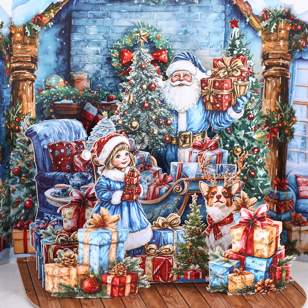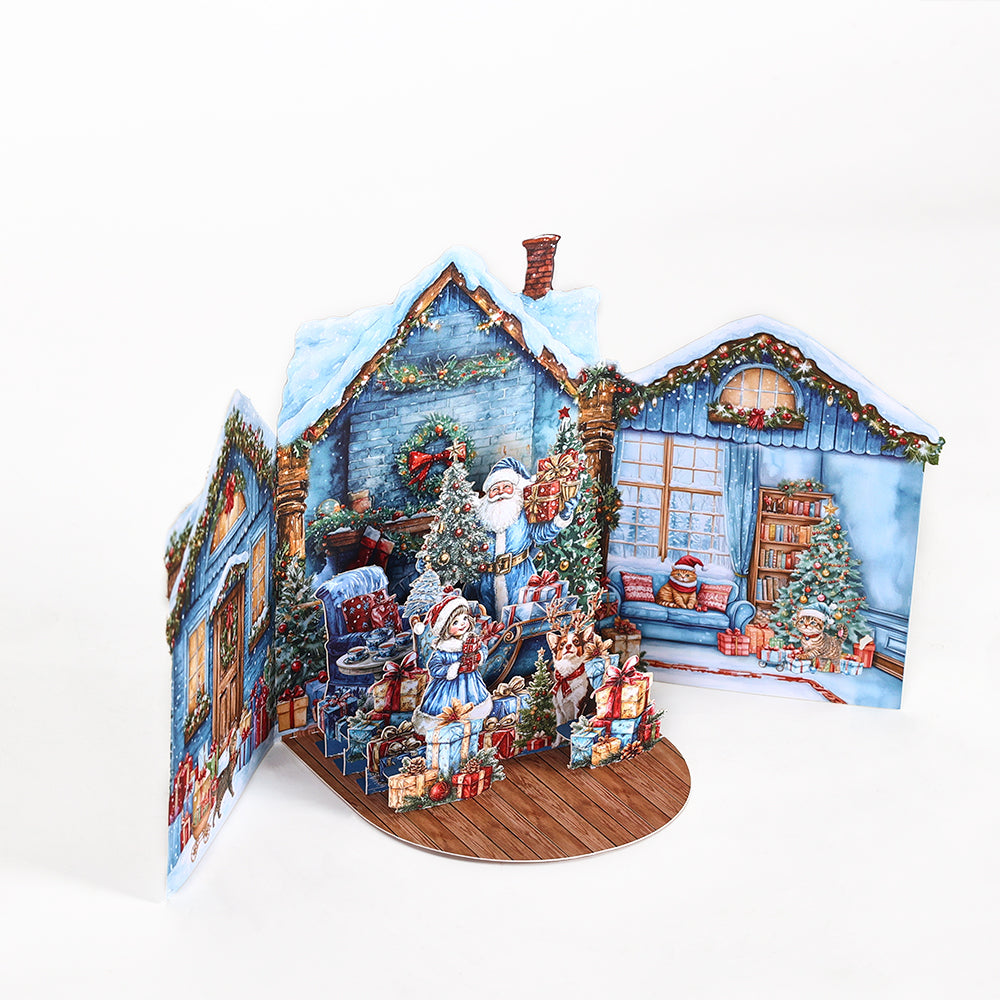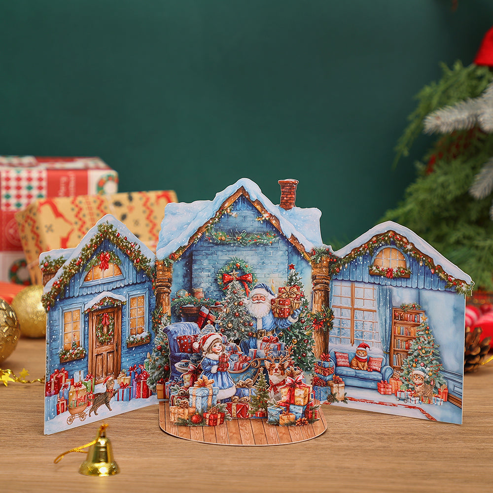 An elegant gatefold Christmas card with a blue courtyard design, offering peaceful winter vibes.