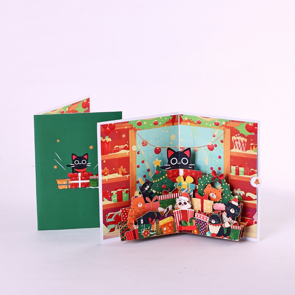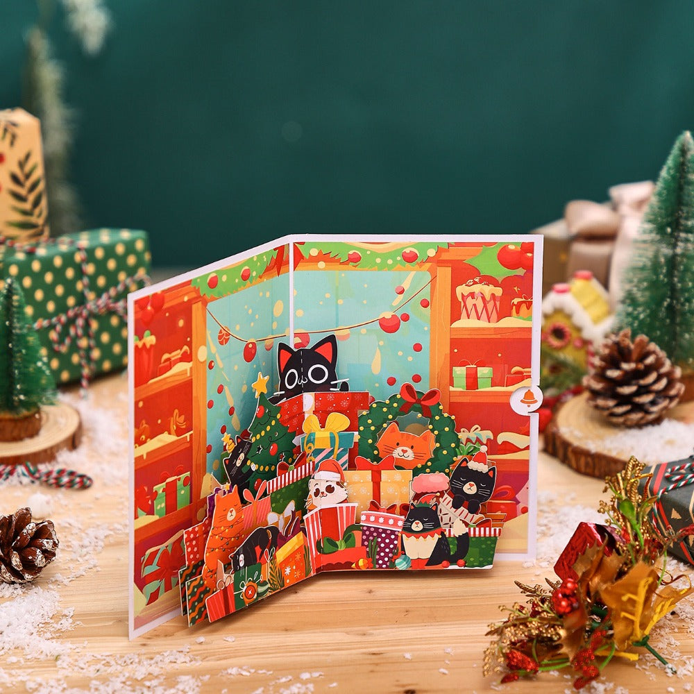 A playful holiday card with a cat party theme, bringing joy and fun to seasonal greetings.
