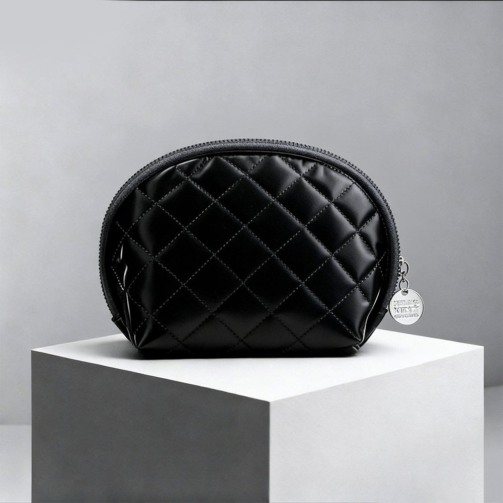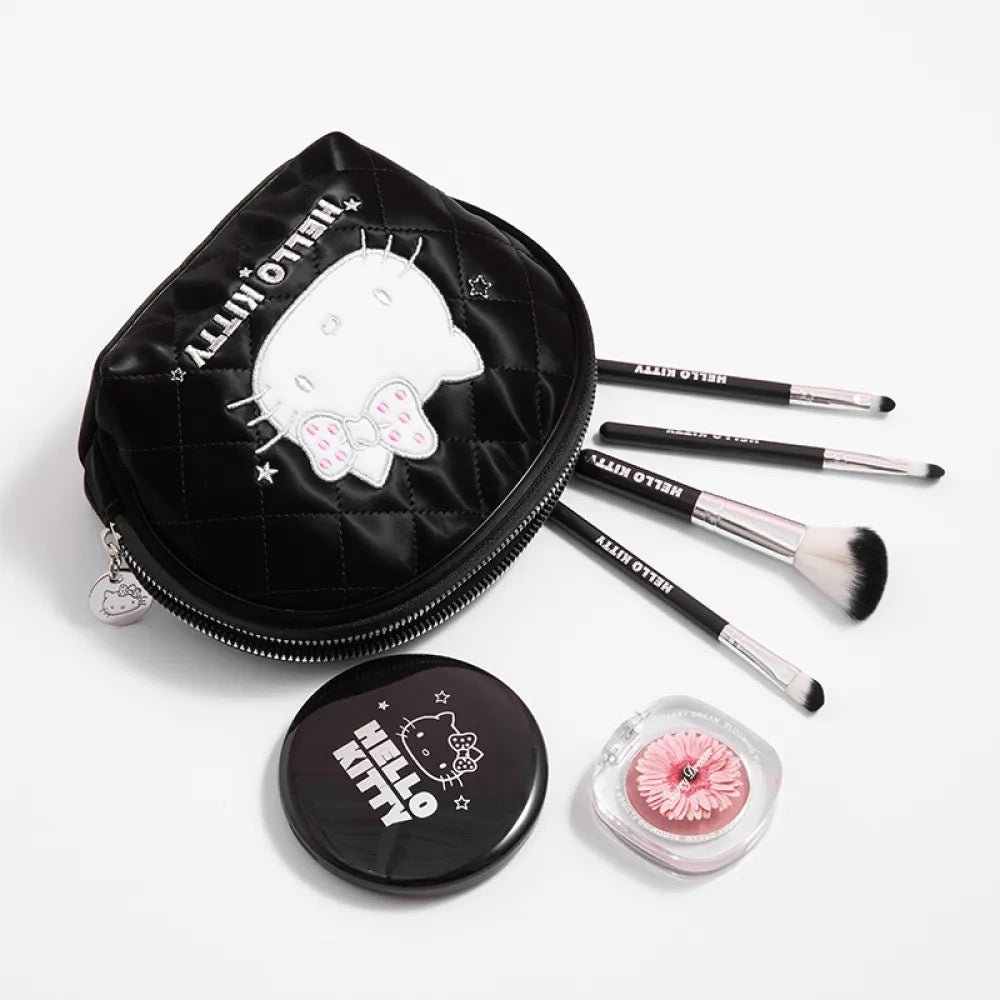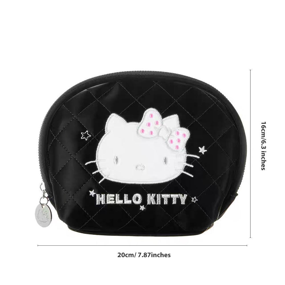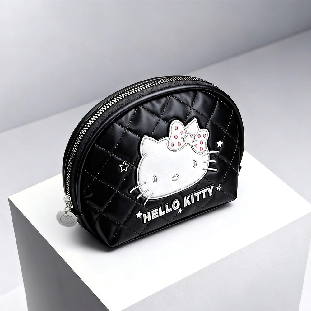 Cute shell-shaped makeup bag in black and white minimalist design with Hello Kitty charm.