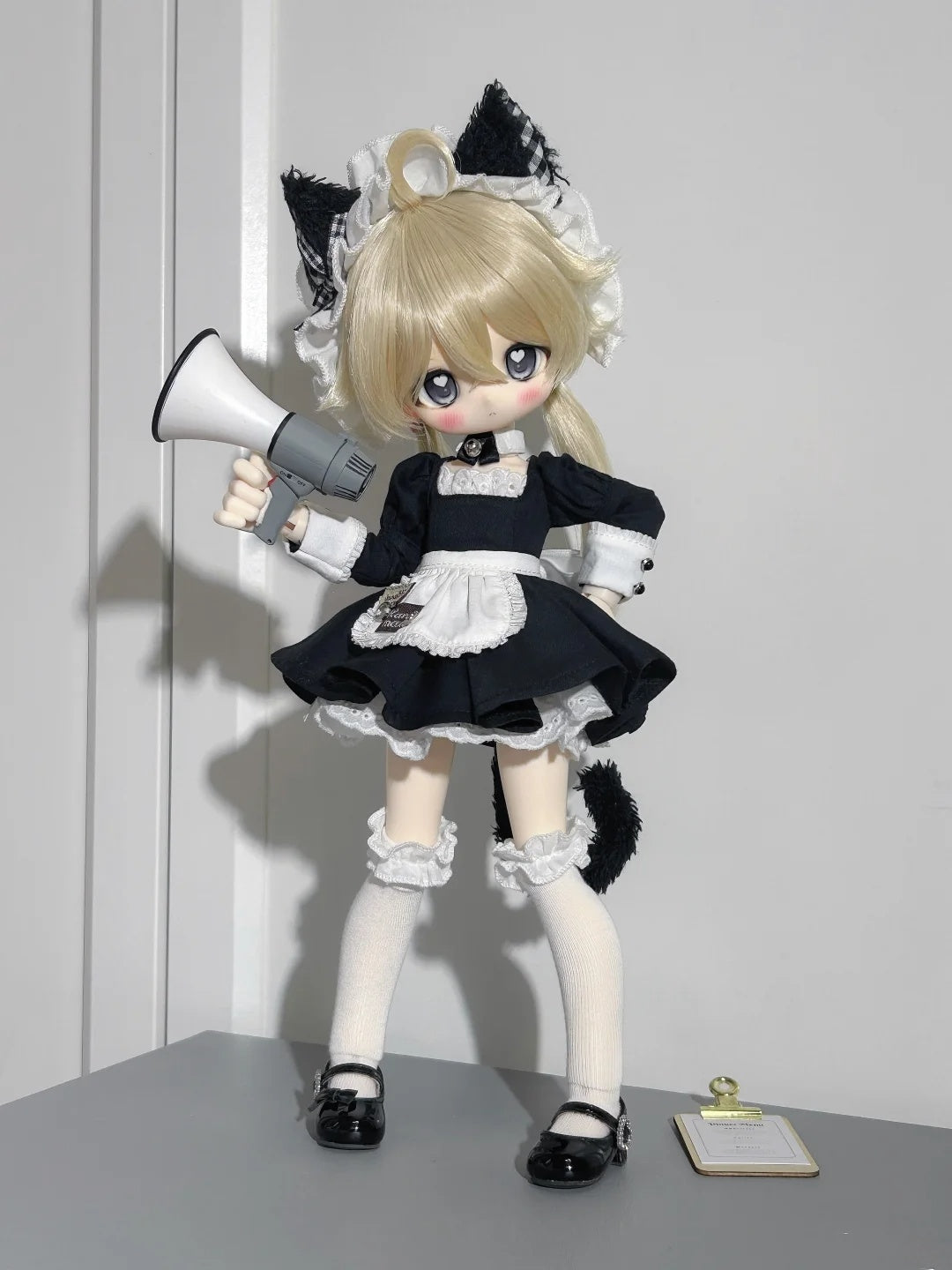 Adorable 5-piece cat maid set for 1/6 YoSD BJD. Includes cat-ear headband, main dress with fluffy tail apron, petticoat, and stockings. Perfect for tiny kitty lovers.