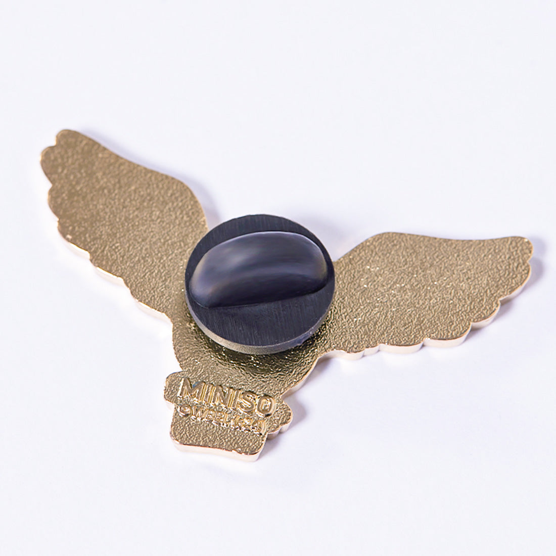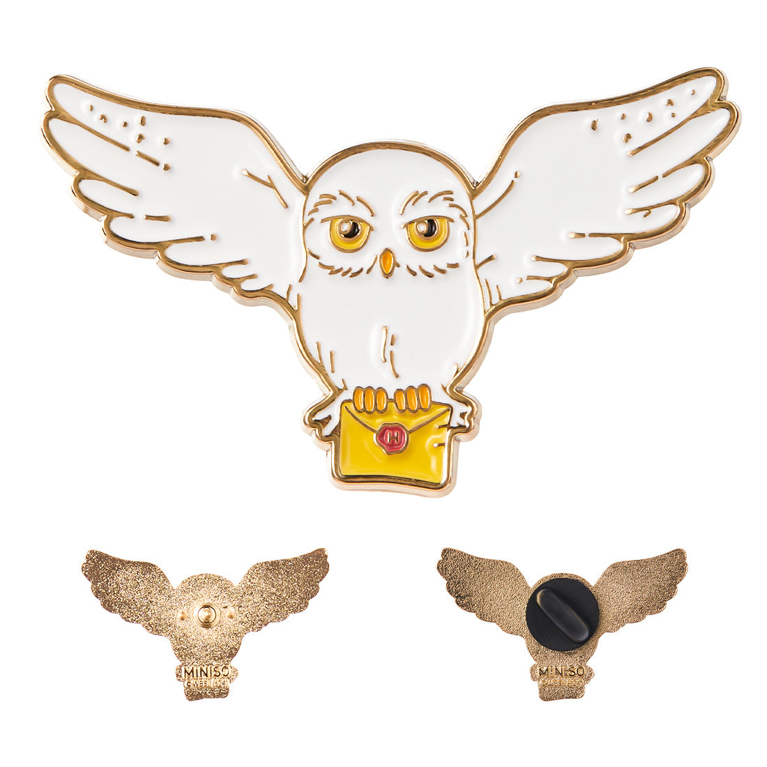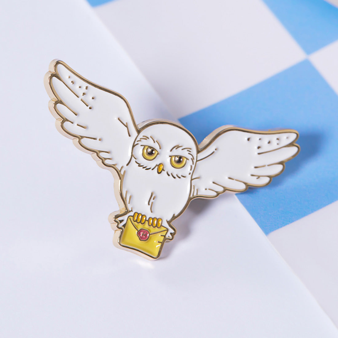 A collectible badge featuring Hedwig and the Golden Snitch, perfect for Harry Potter enthusiasts.