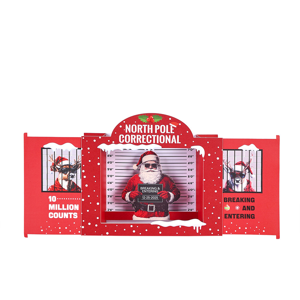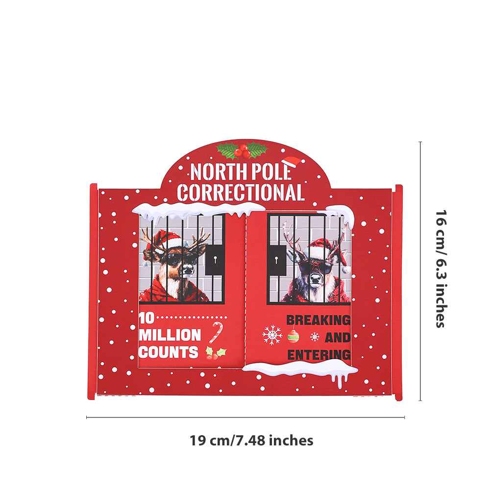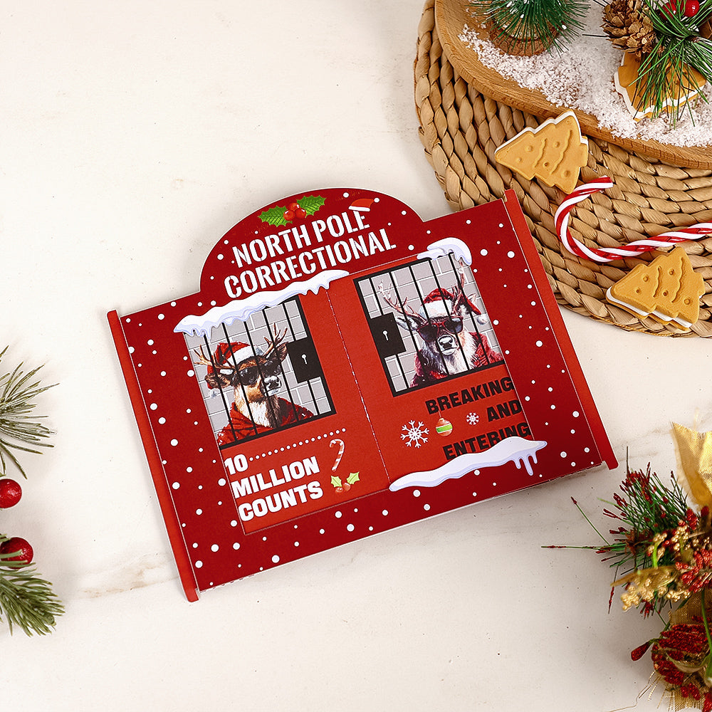 A cheeky novelty Christmas greeting card with a tongue-in-cheek "North Pole Correctional" design showing Santa and reindeer behind bars — perfect as a gag gift or playful holiday note. Printed on sturdy cardstock for a memorable, laugh-worthy seasonal greeting.