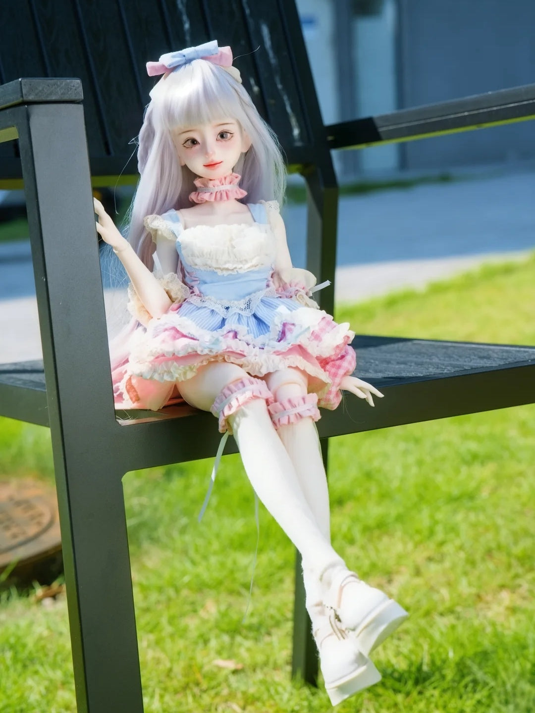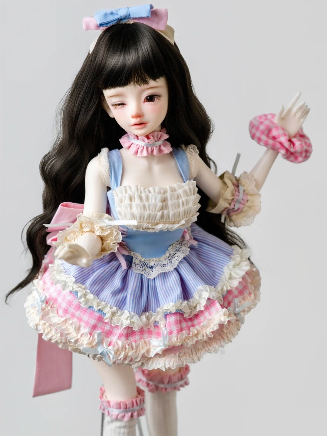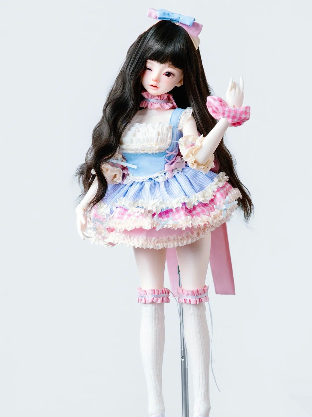 Super sweet 9-piece kawaii set for 1/4 slim/chubby/fat girl BJD. Includes sleeveless lace top, triple-layer skirt, bow headband, arm warmers, scrunchie, long stockings, and giant double bow.