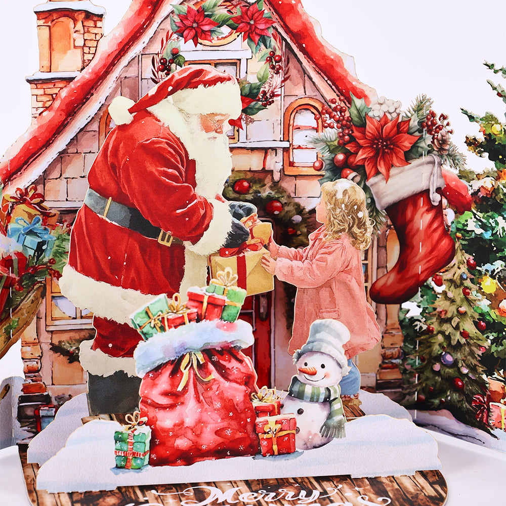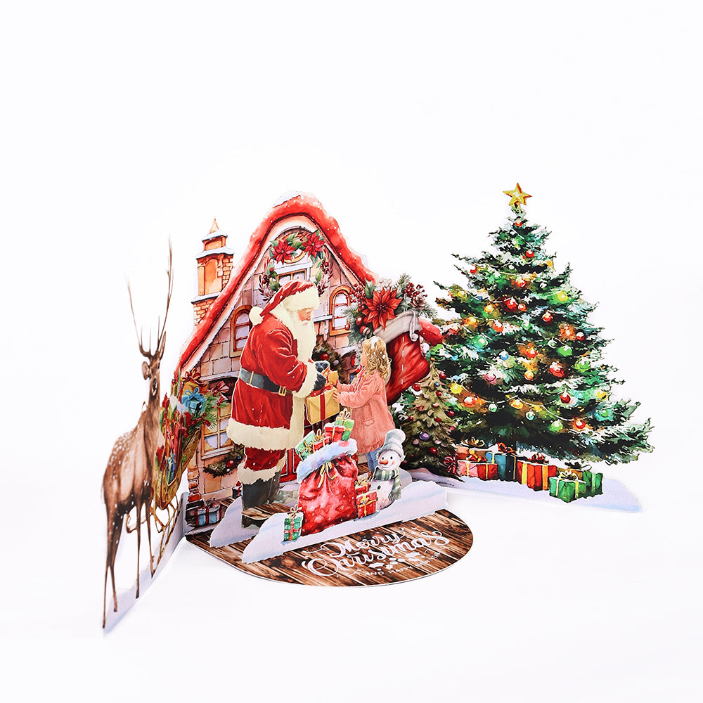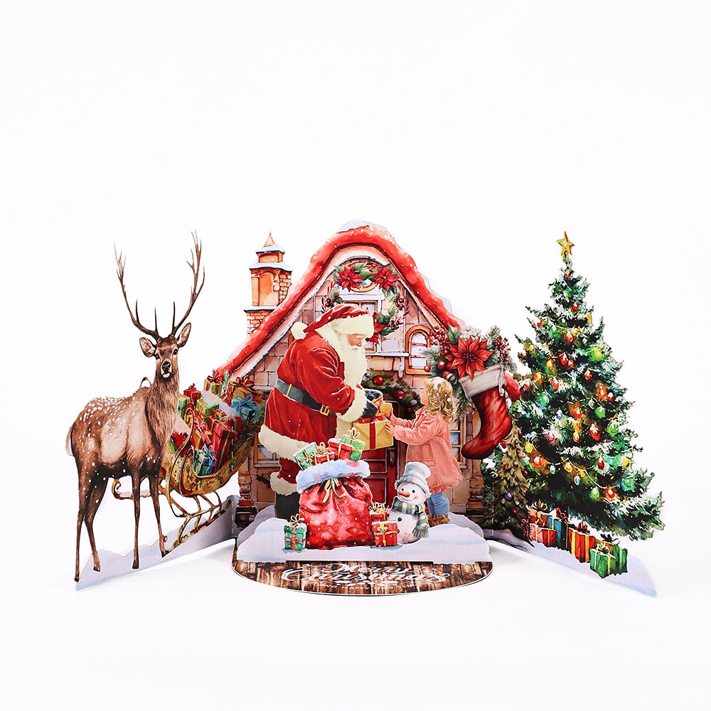 A 3D pop-up Christmas card with Santa delivering gifts, ideal for spreading joy and festive cheer.