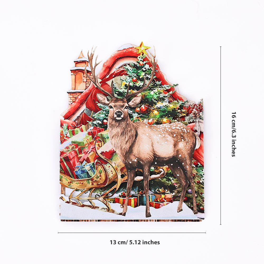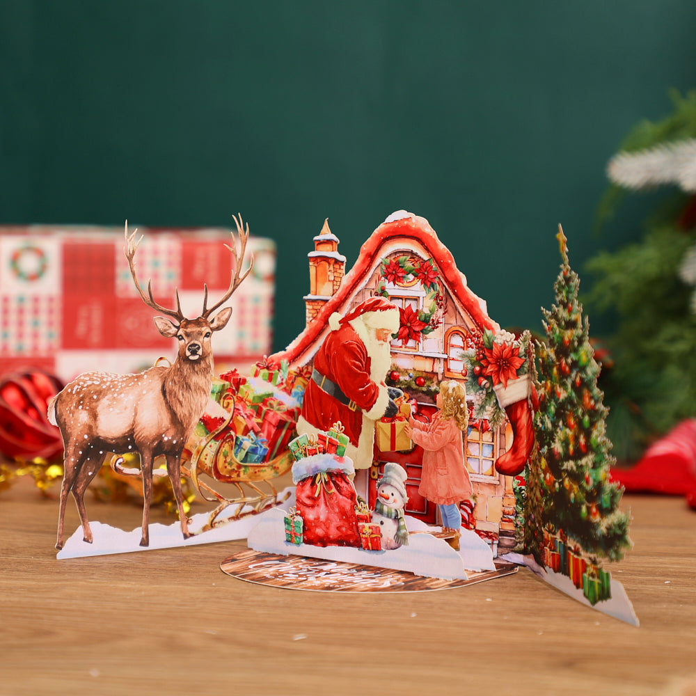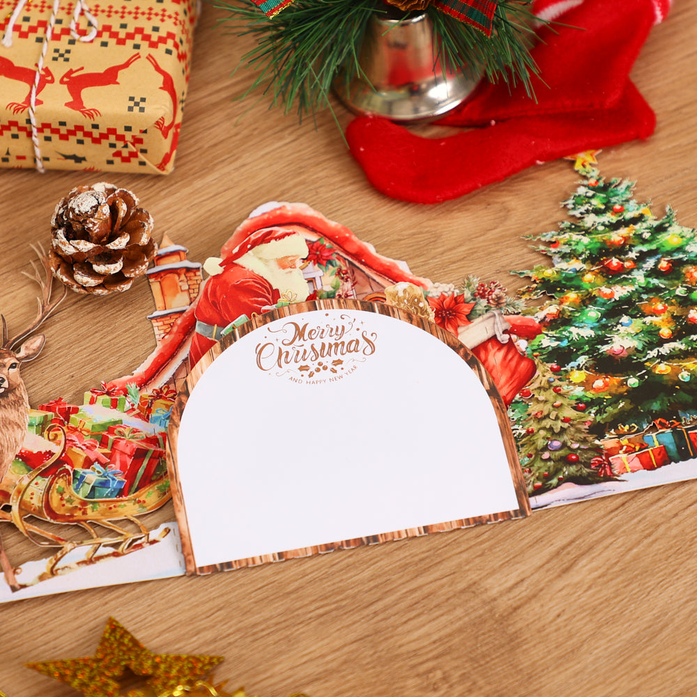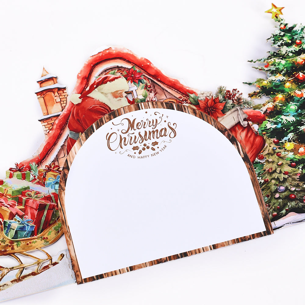 A 3D pop-up Christmas card with Santa delivering gifts, ideal for spreading joy and festive cheer.