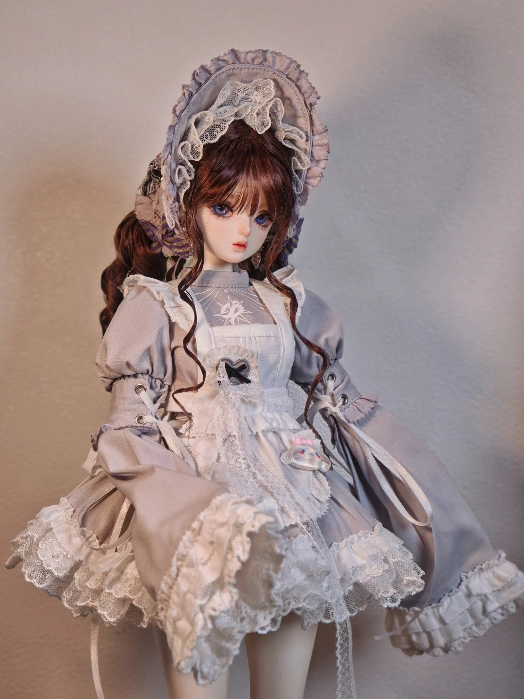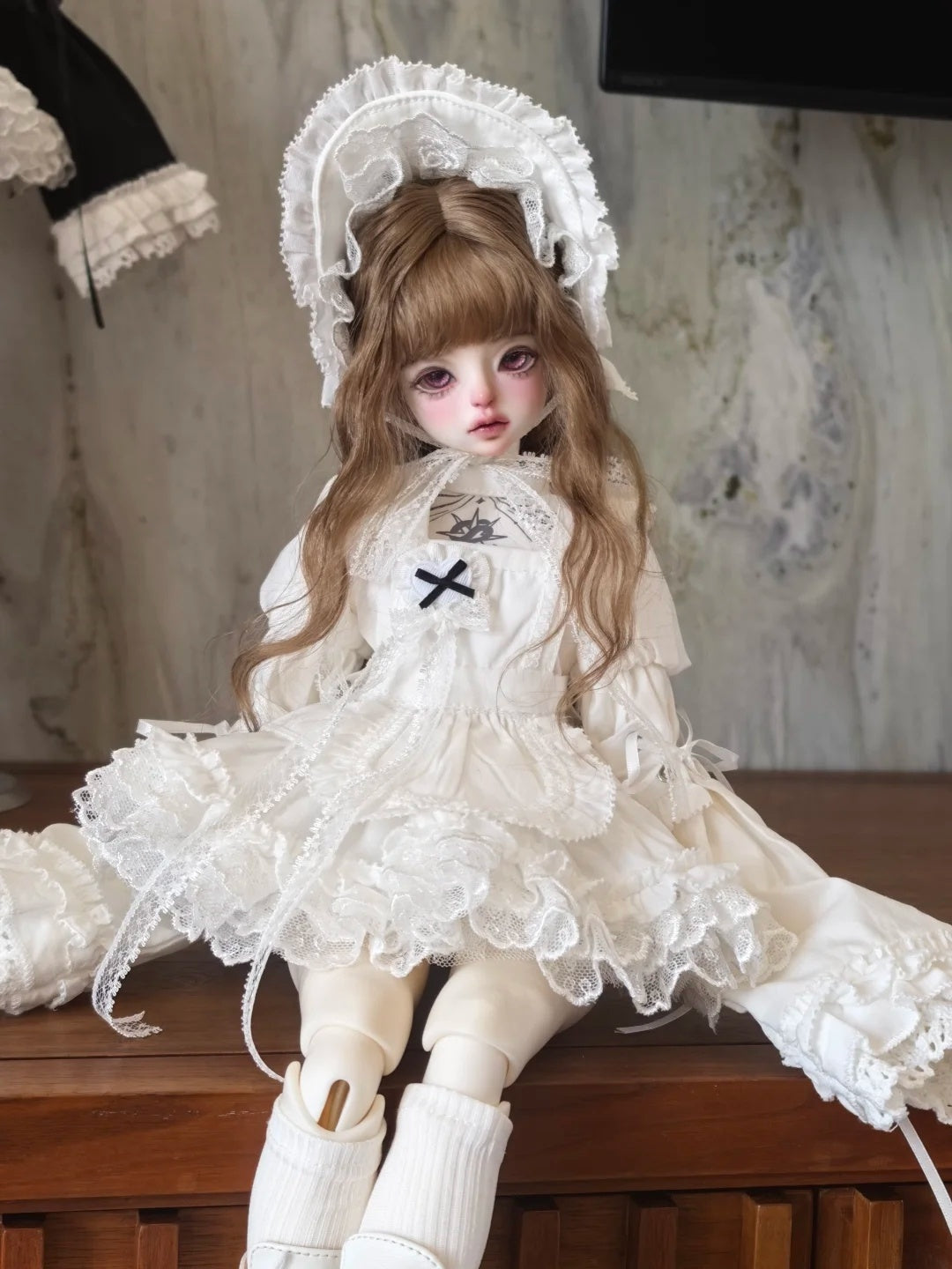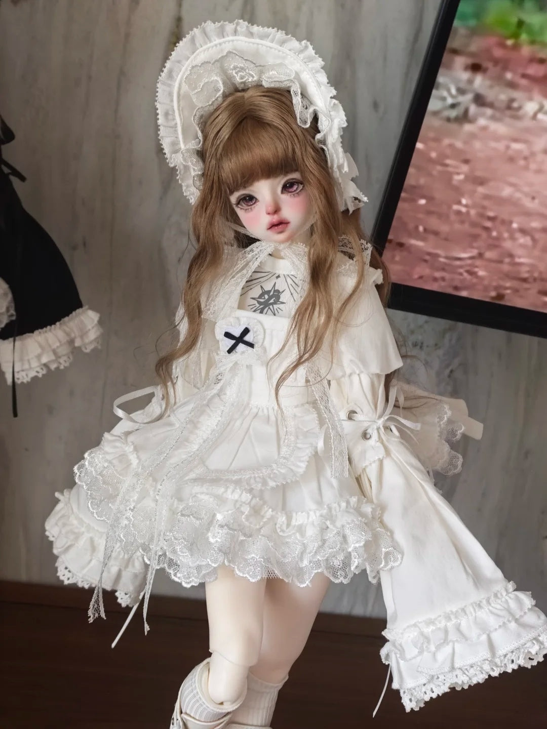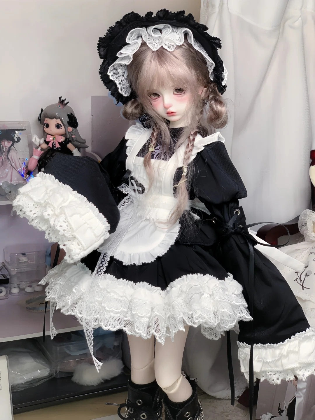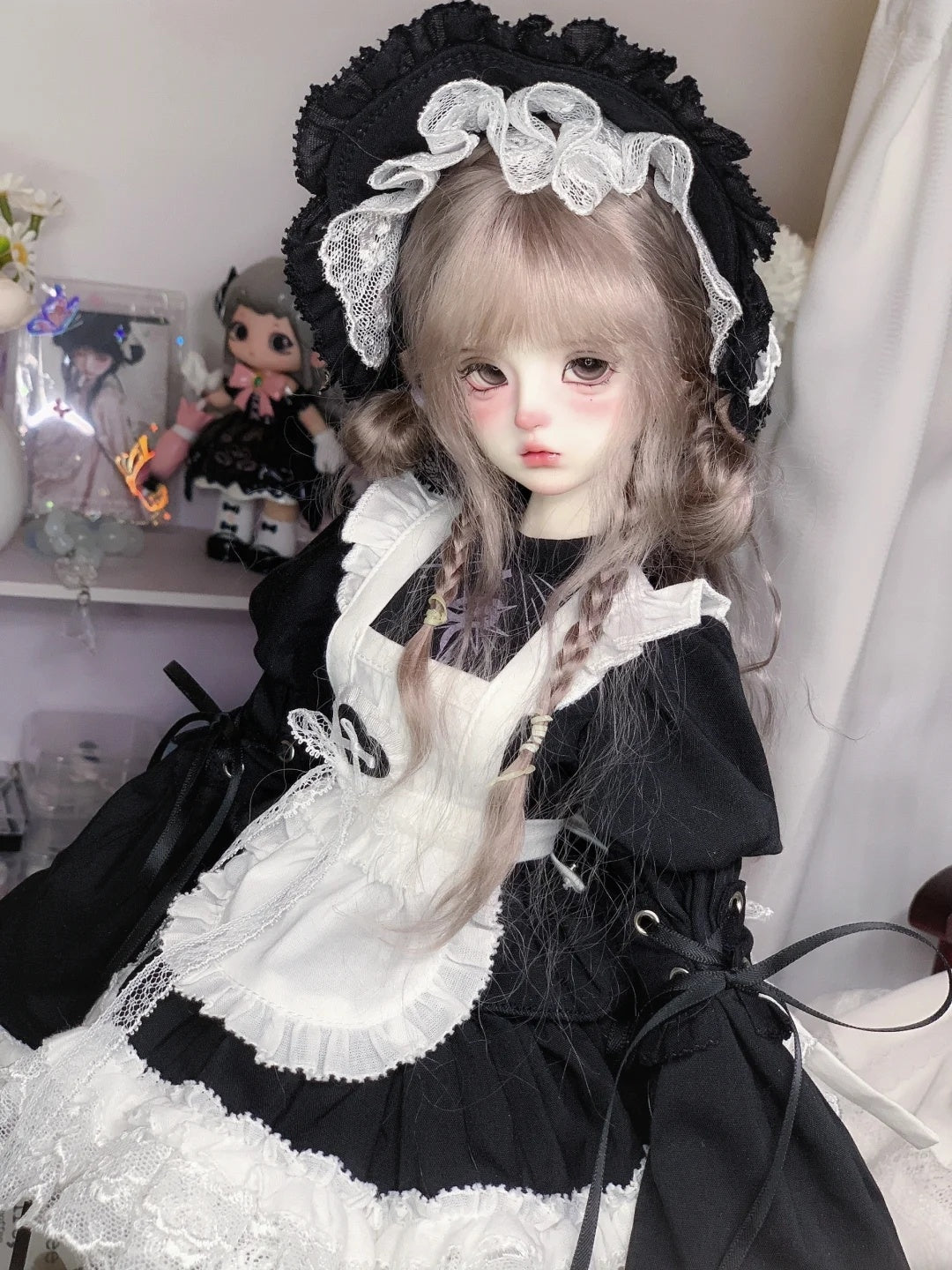 Unique 10-piece snake maid set for 1/4 girl BJD (fits bust 18.5-23 cm). Includes magnetic heart decor, bonnet, apron, sleeves, top, skirt, pants, petticoat, stockings, and anti-stain inner shirt.