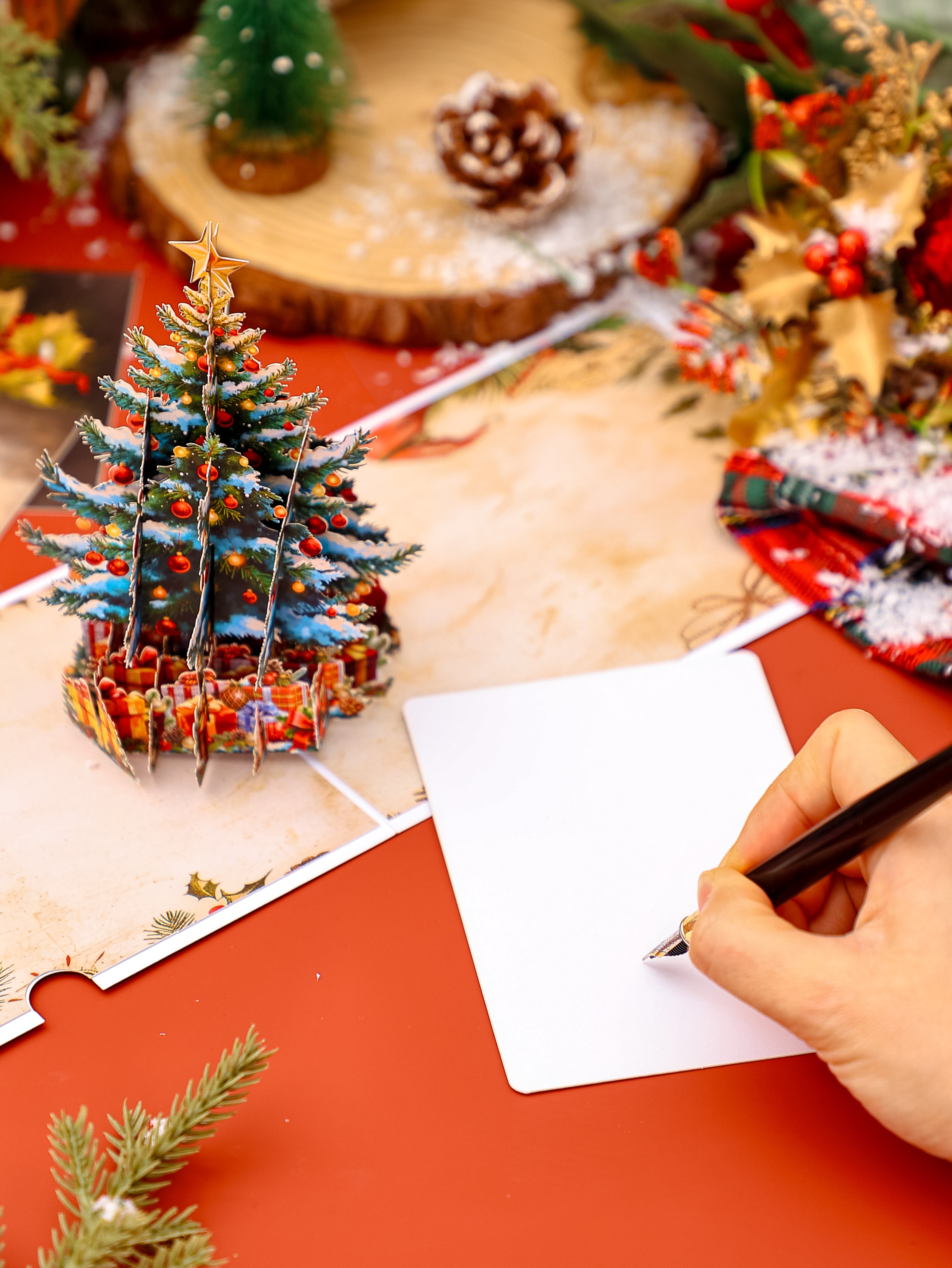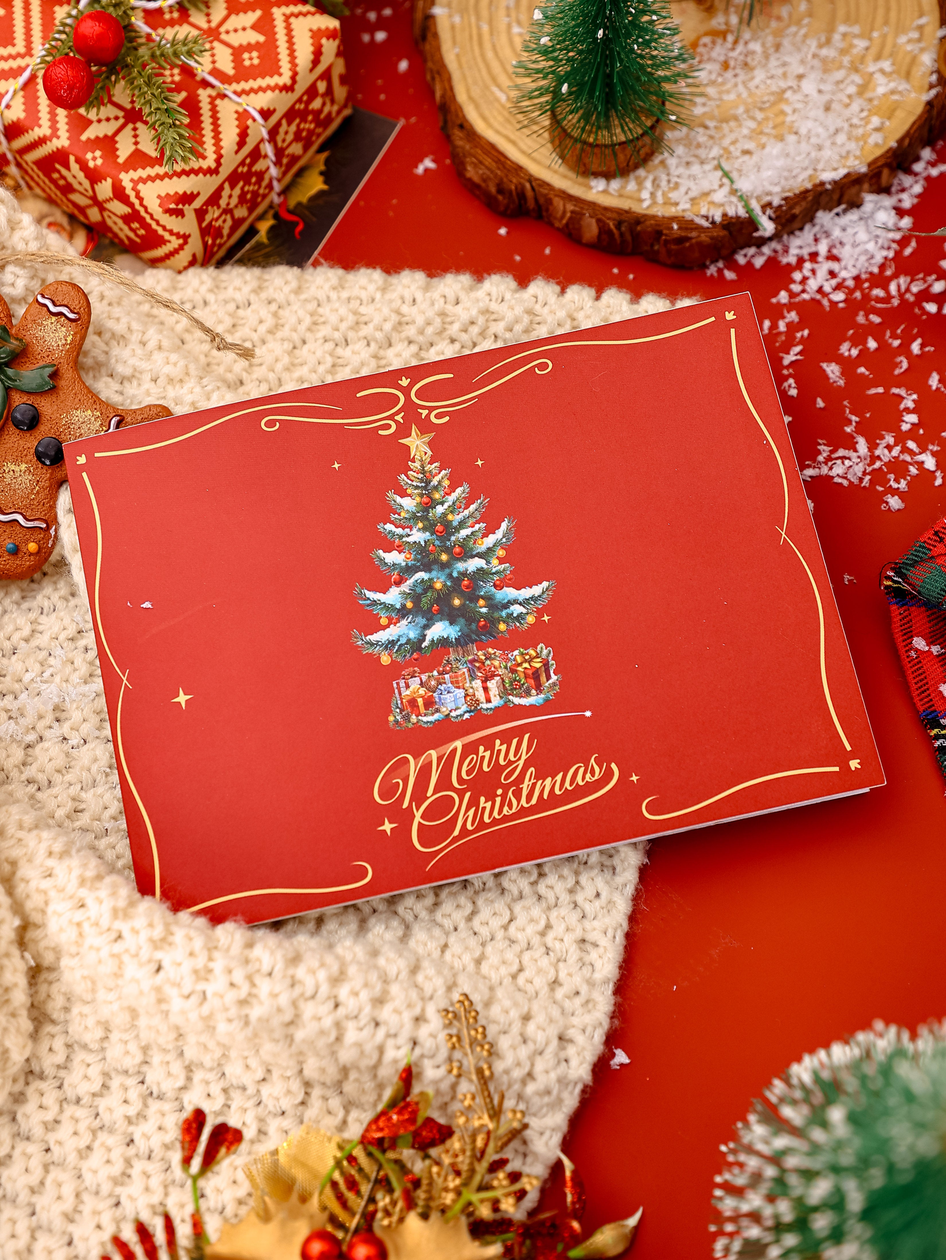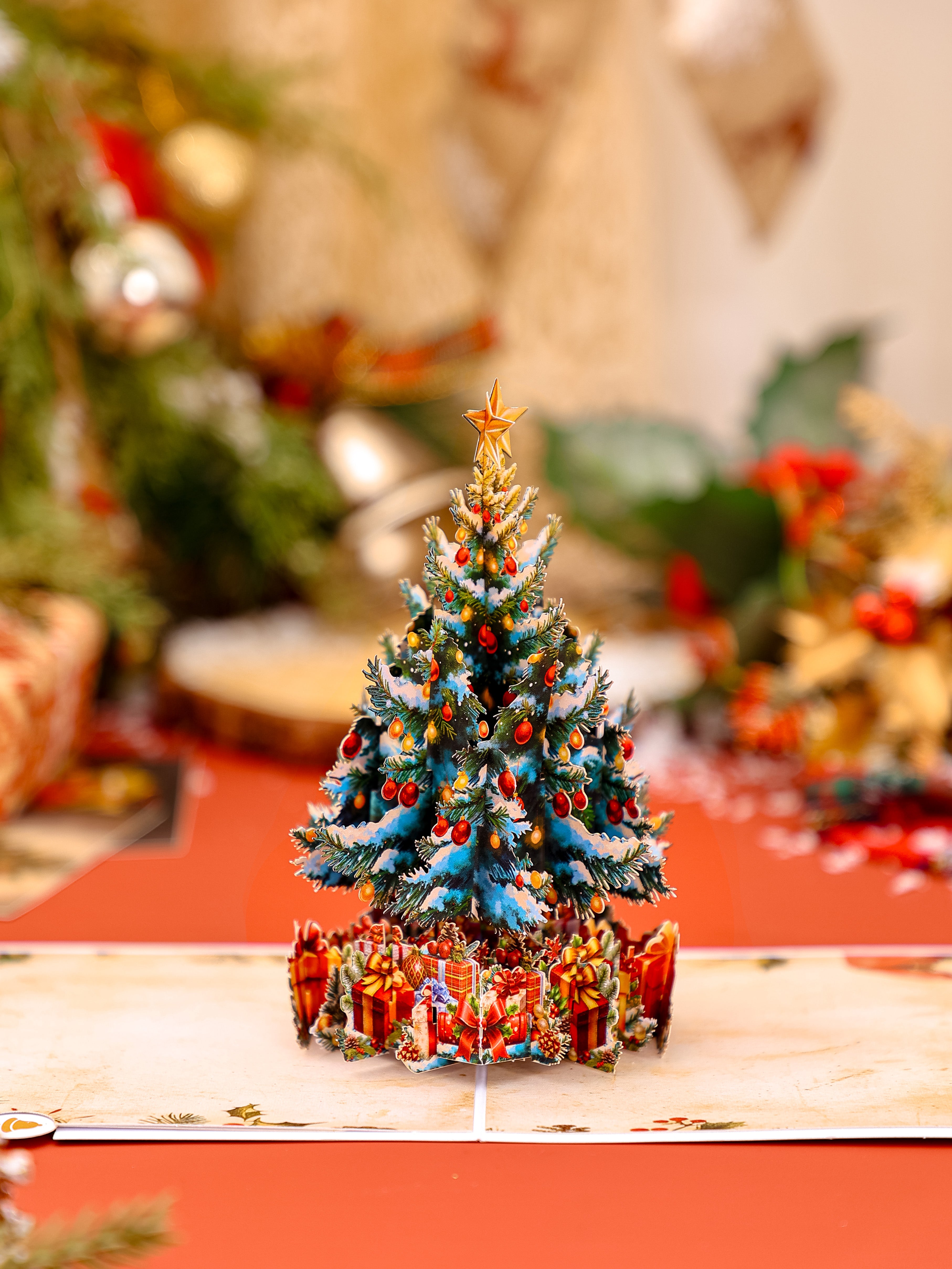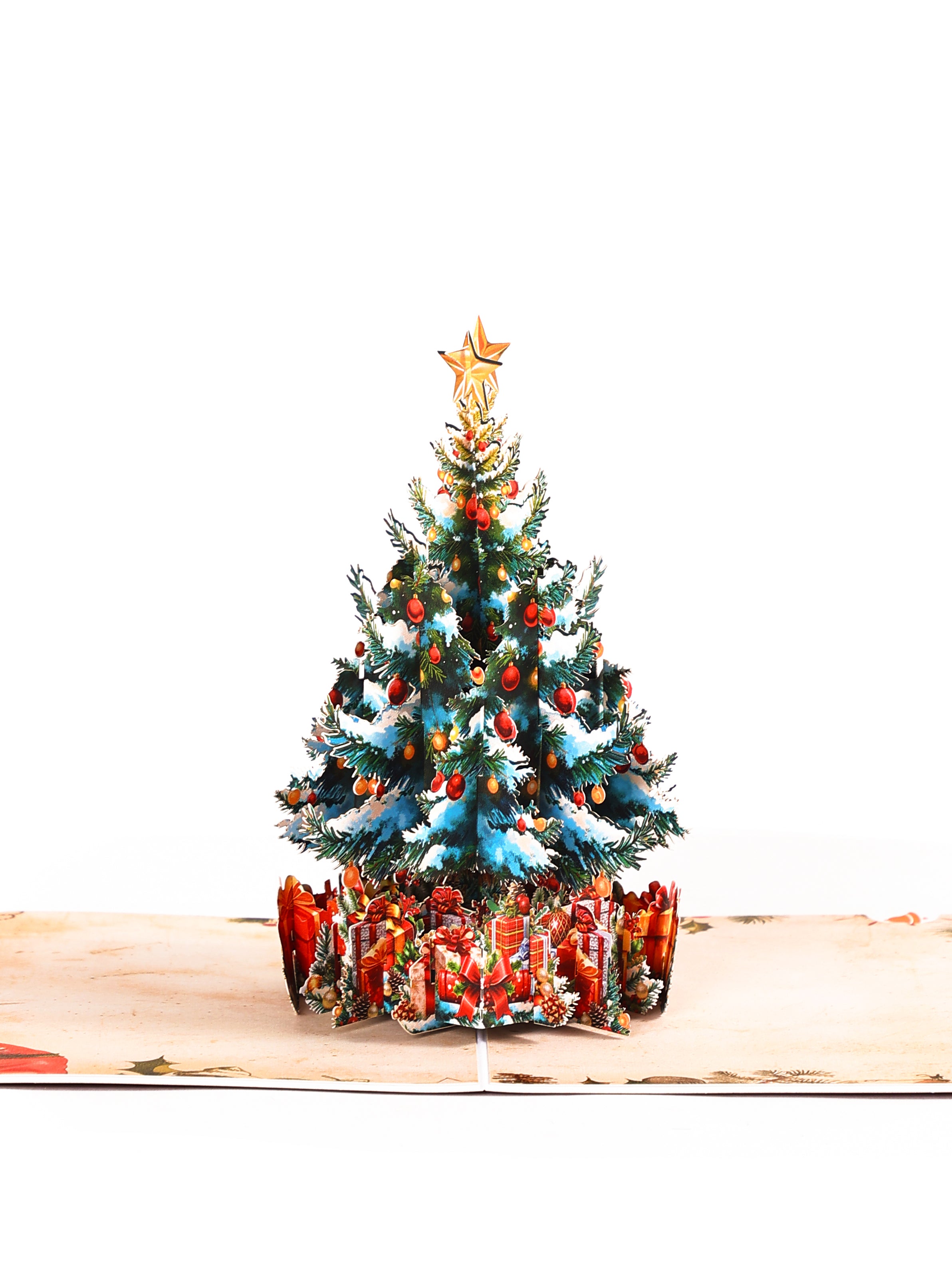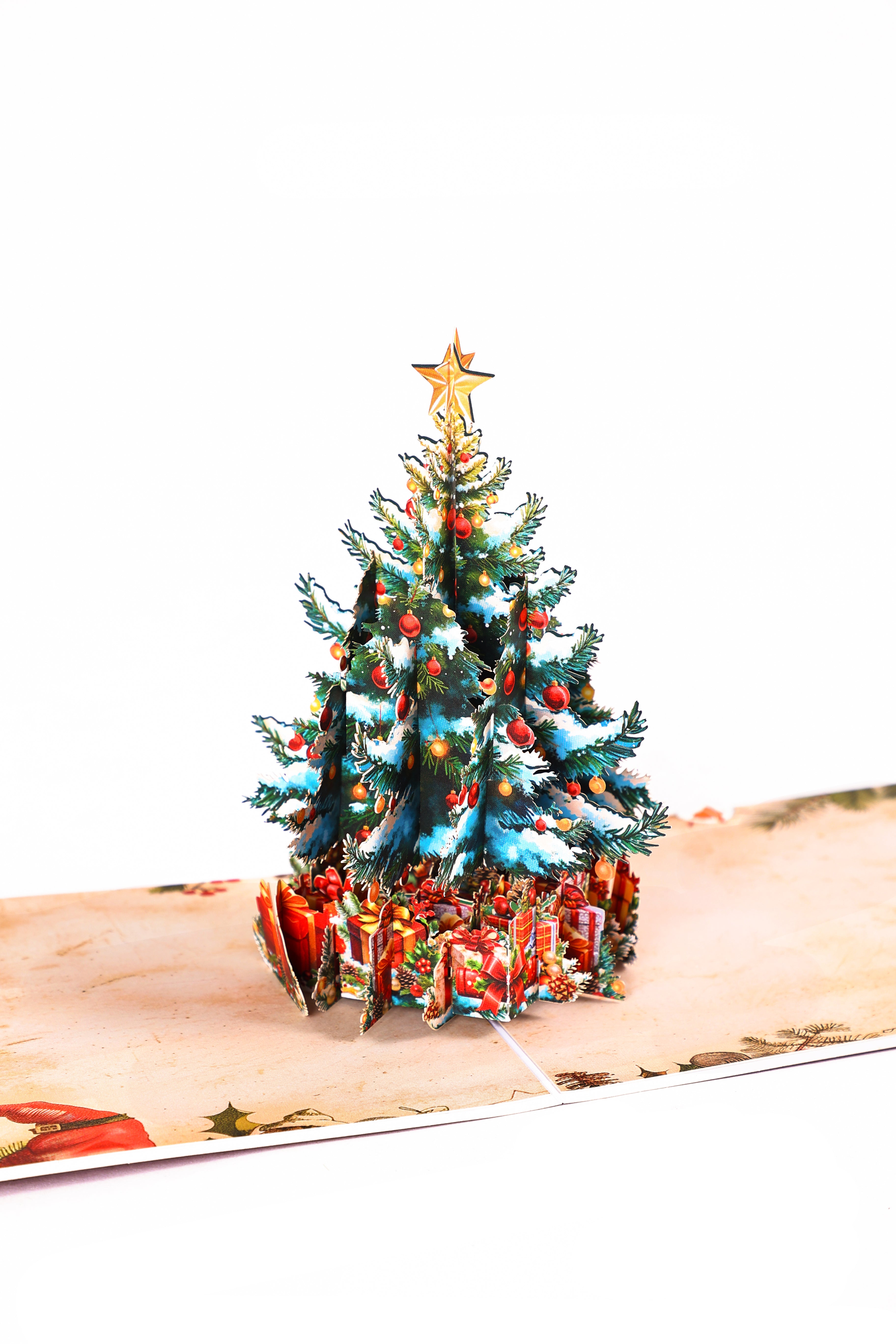 A festive pop-up card with a star-topped Christmas tree, making a beautiful gift or holiday decoration.